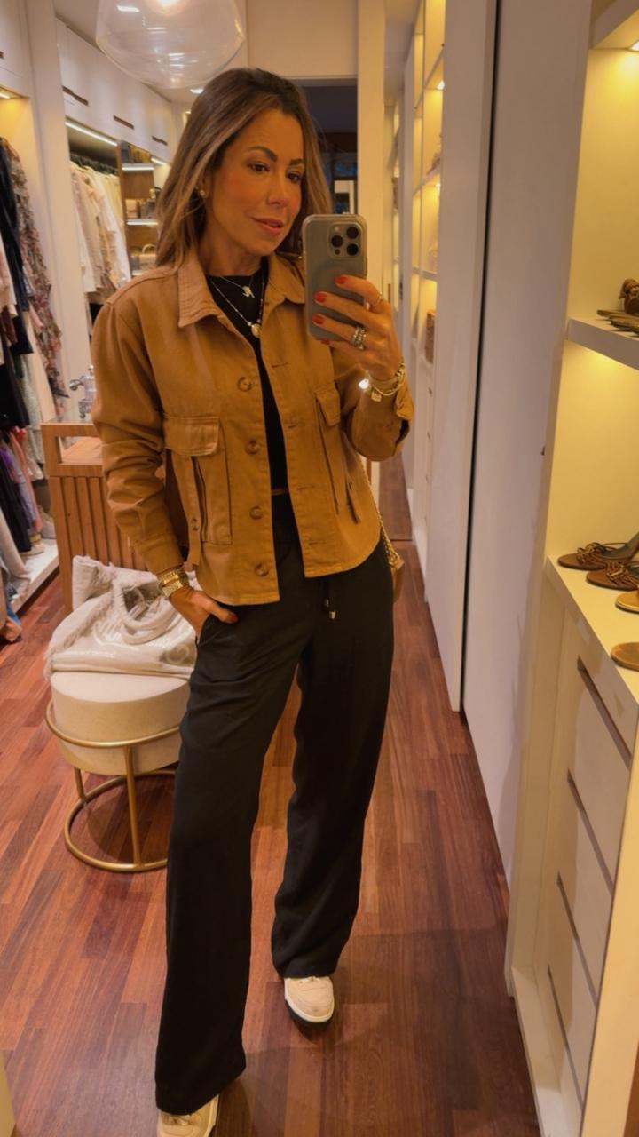 Tecido:Sarja algodão.Botões resinados.Mangas longas.Bolsos com martingale.