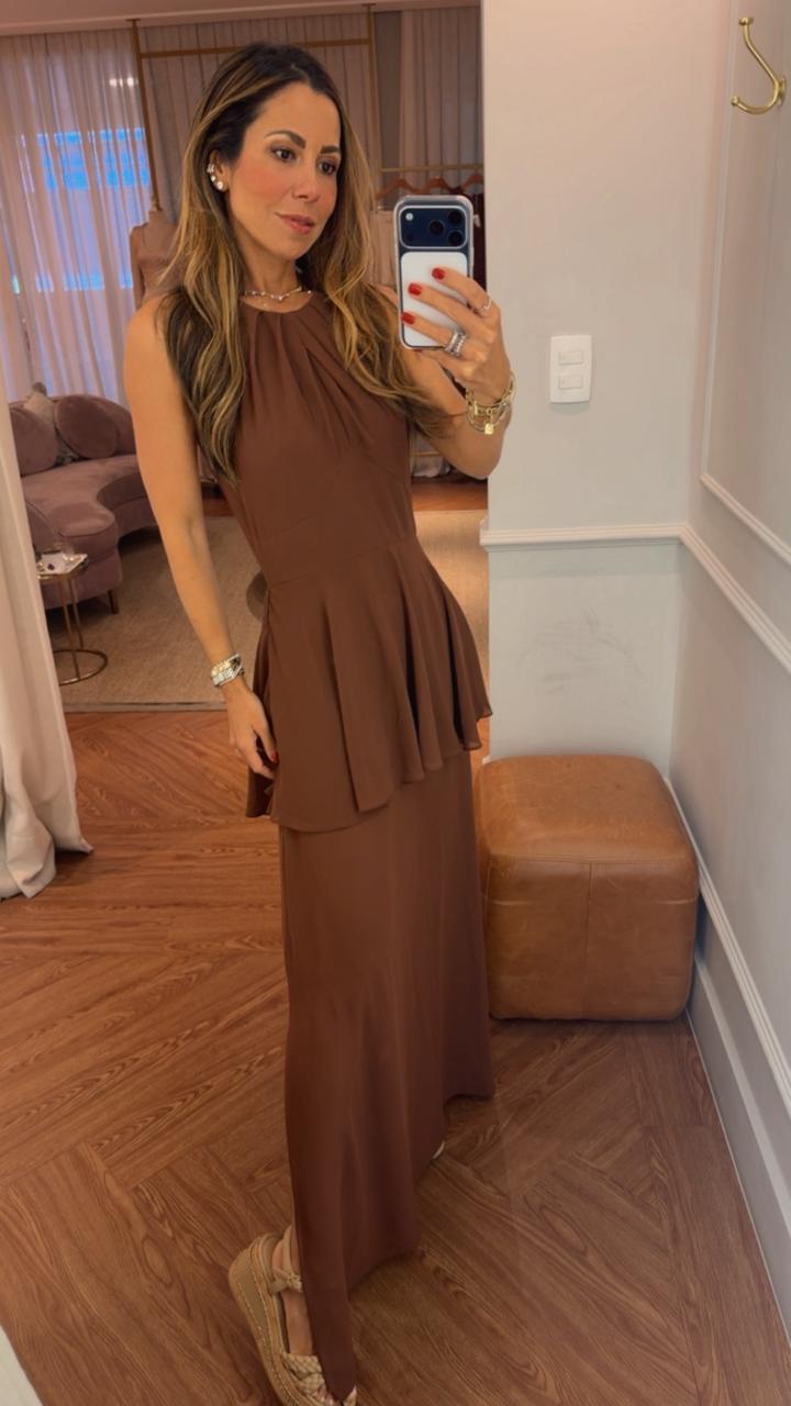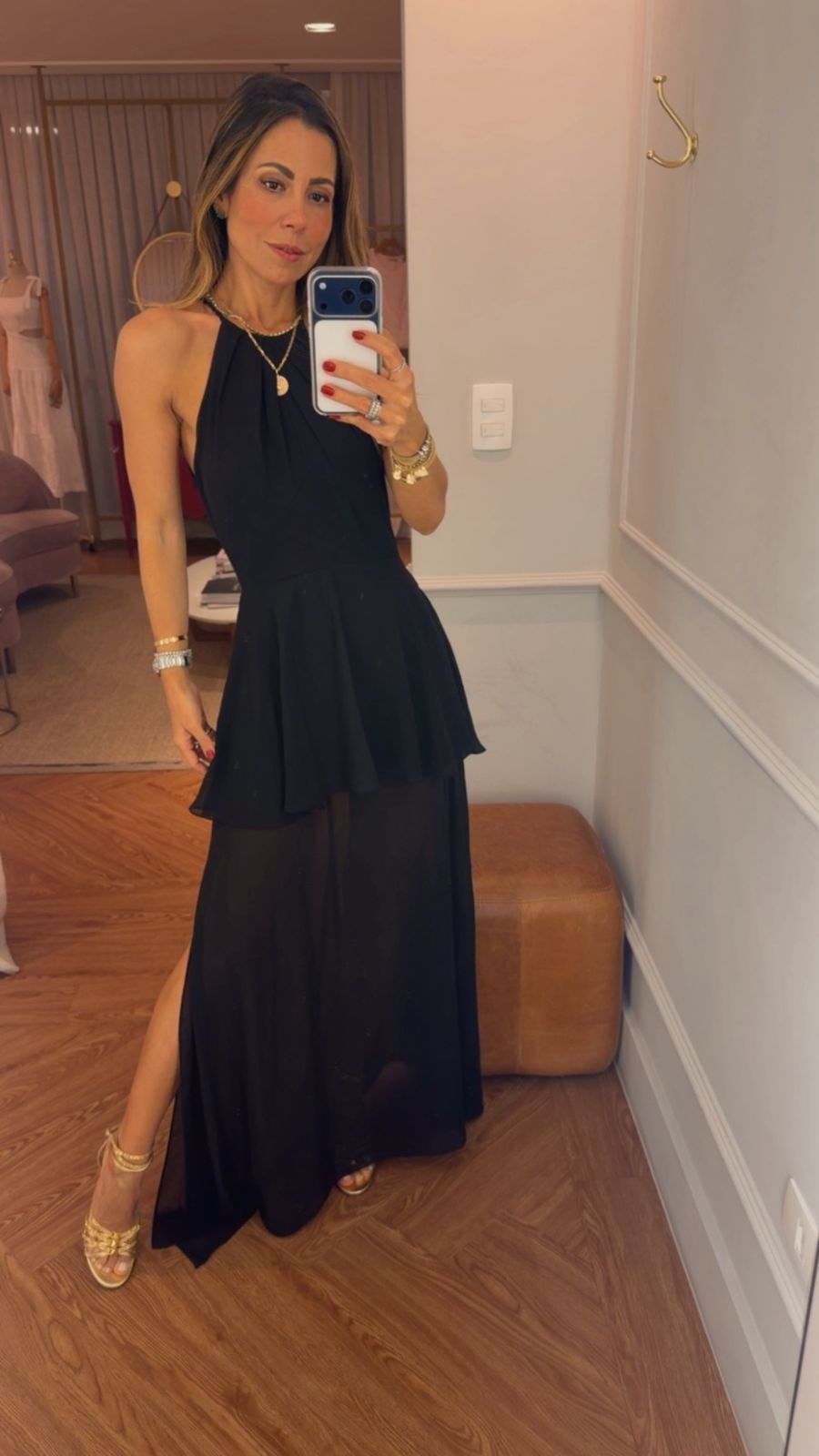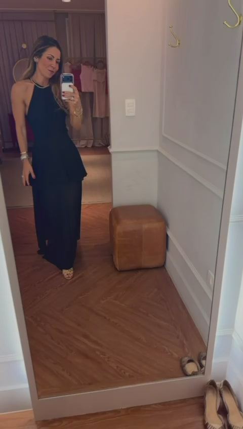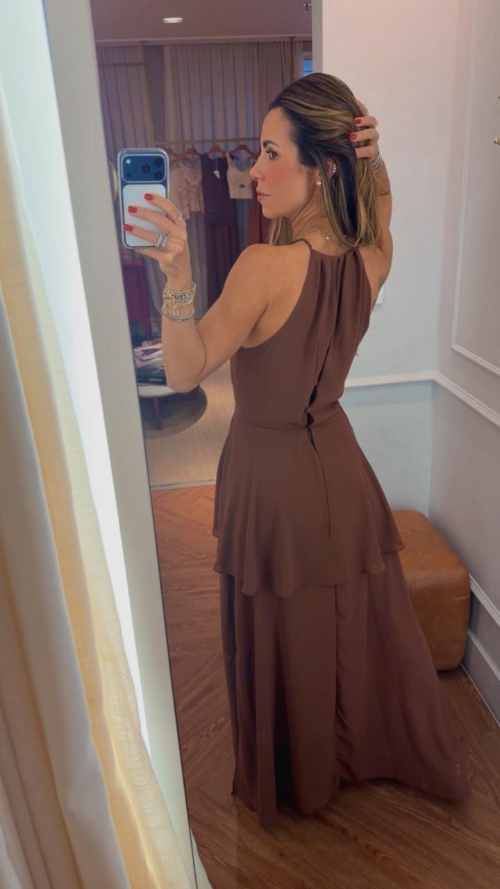 Fechamento em zíper na parte de trás no quadril e fechamento costas em botões forrados.
