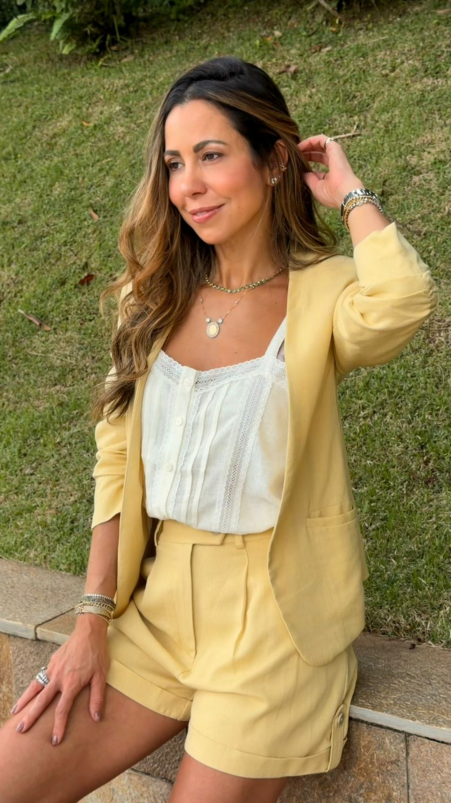 Botões em madrepérola na cor do tecido.